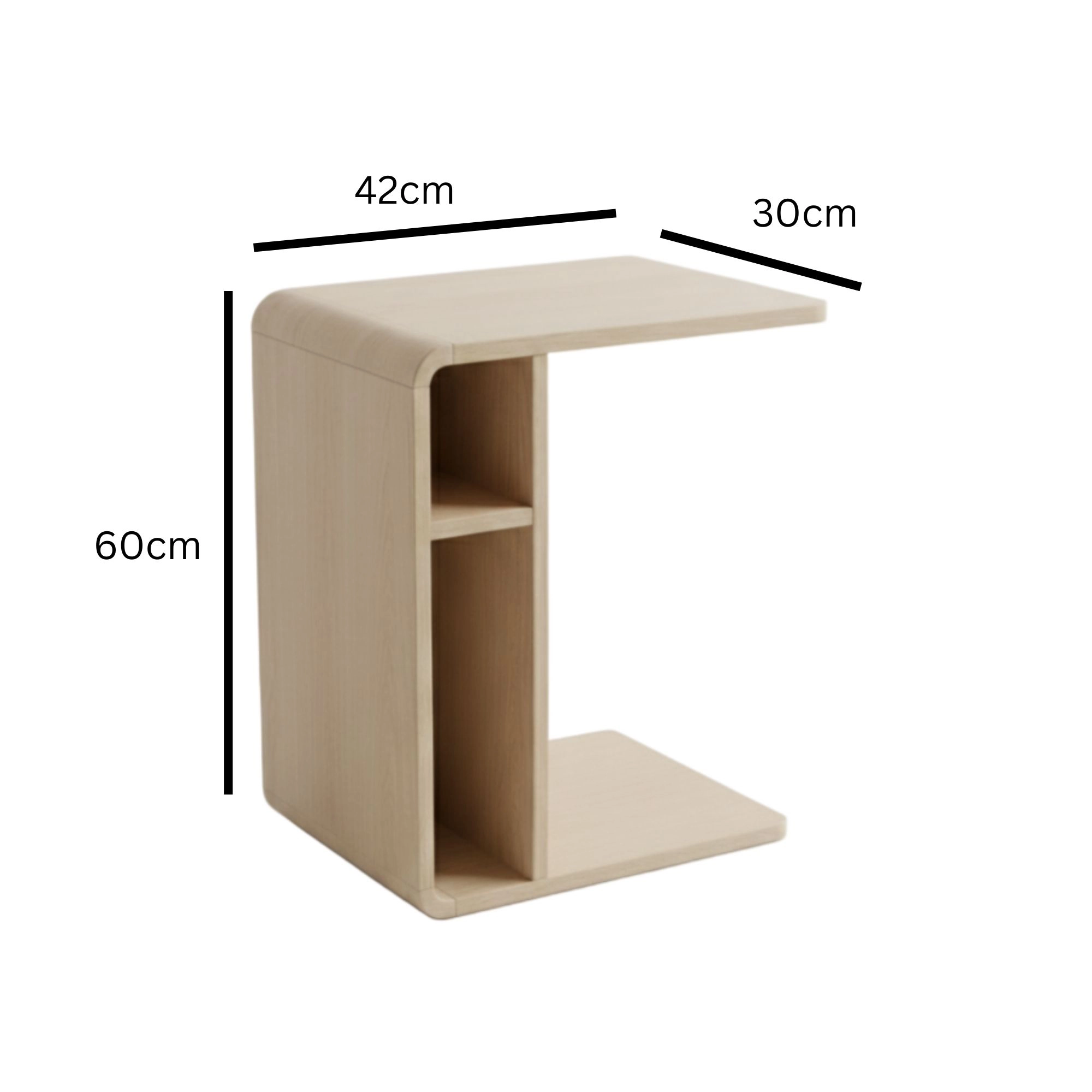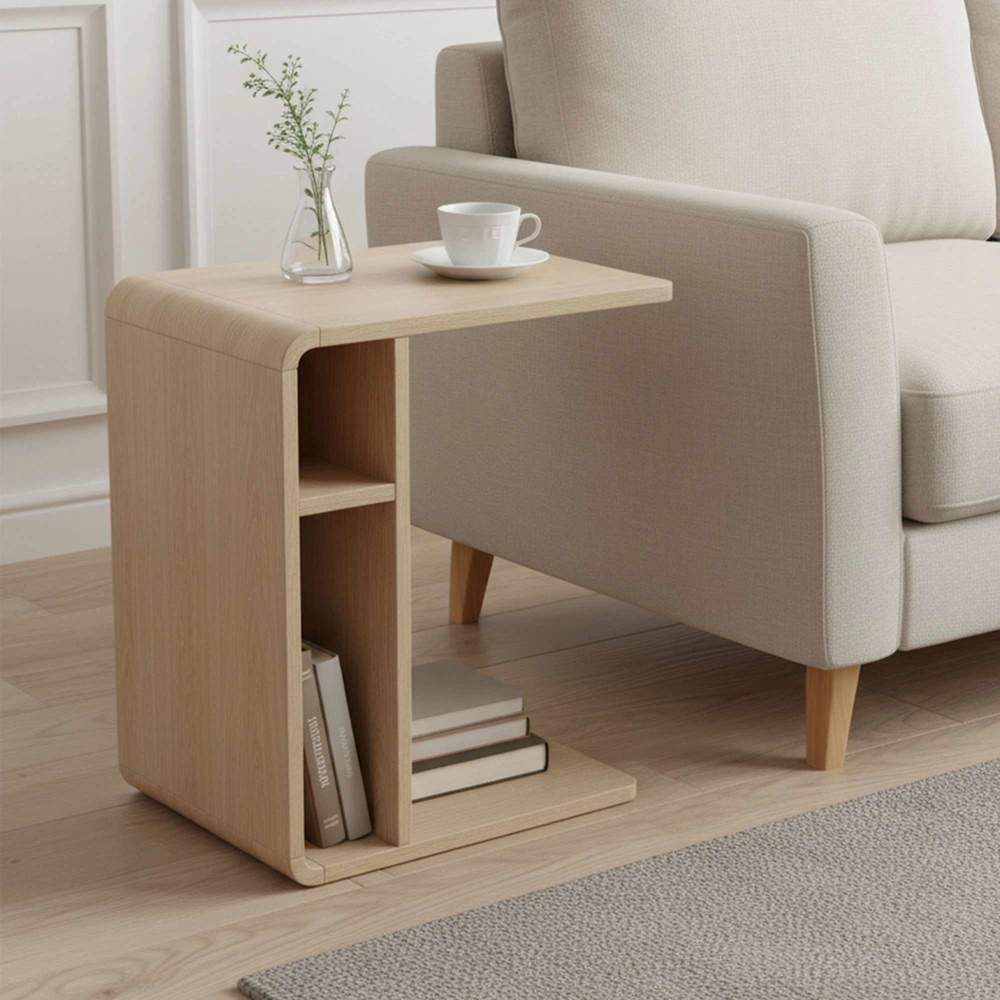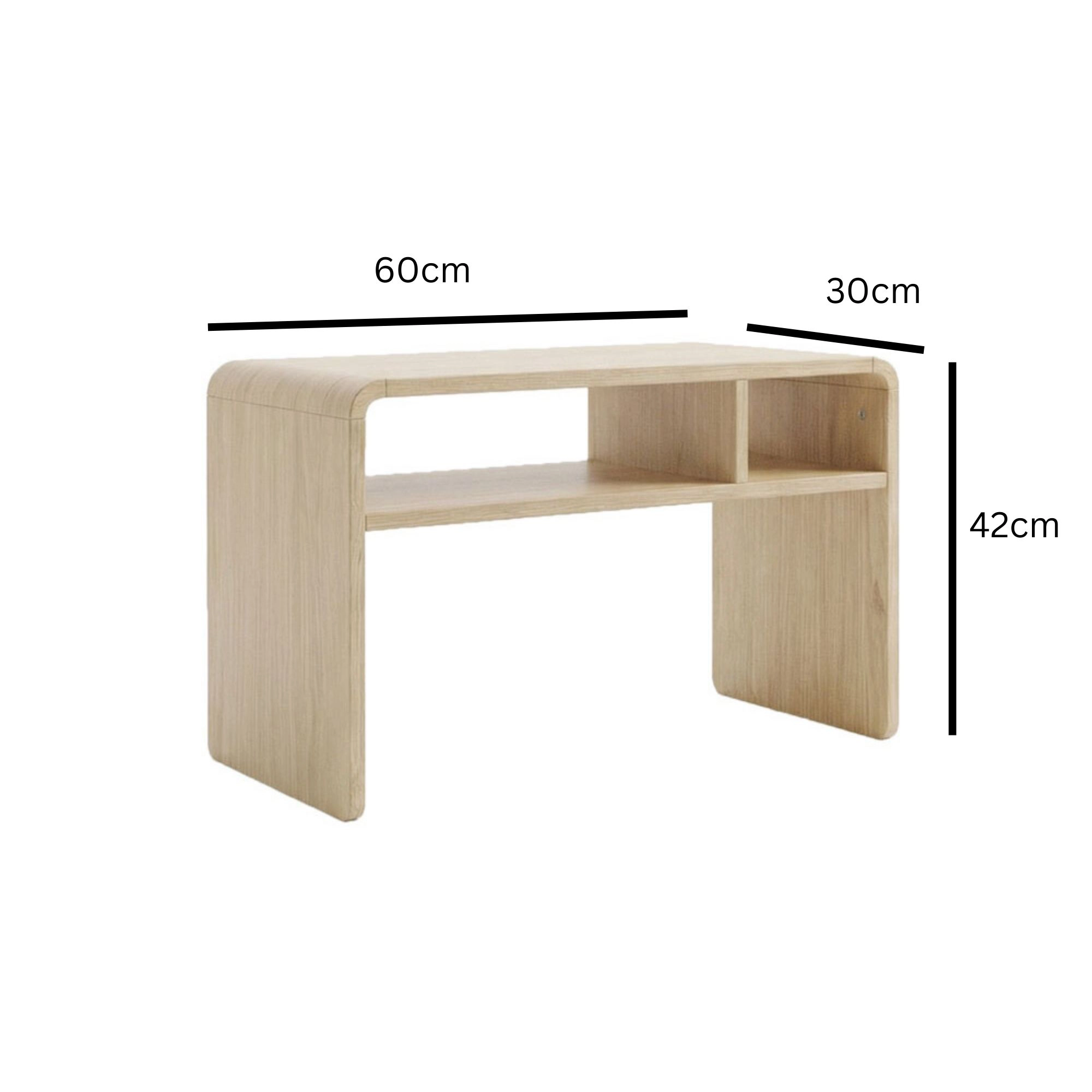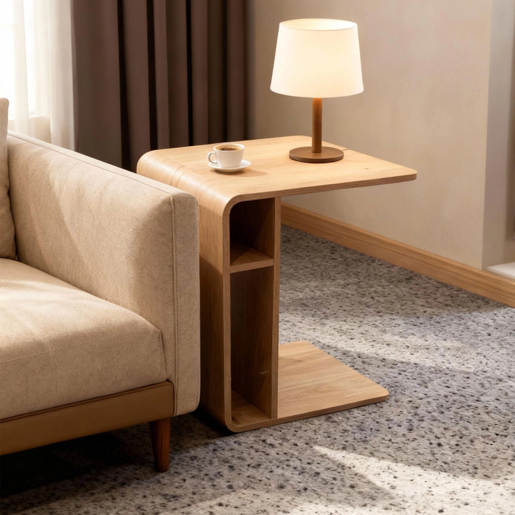 Crafted from durable MDF and rubberwood, it features smooth curved edges and a warm Light Oak color that blends seamlessly with contemporary, Scandinavian, or minimalist interiors. A tidy adjustable shelf gives you flexible storage for books, décor, remotes, or everyday essentials, helping keep surfaces clear without adding bulk.