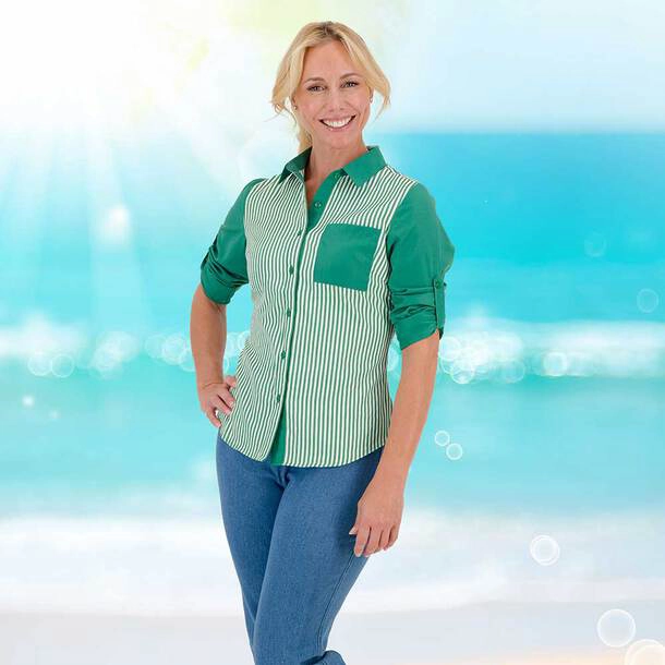 A stylish, versatile striped shirt with roll-up sleeves and a flattering casual fit